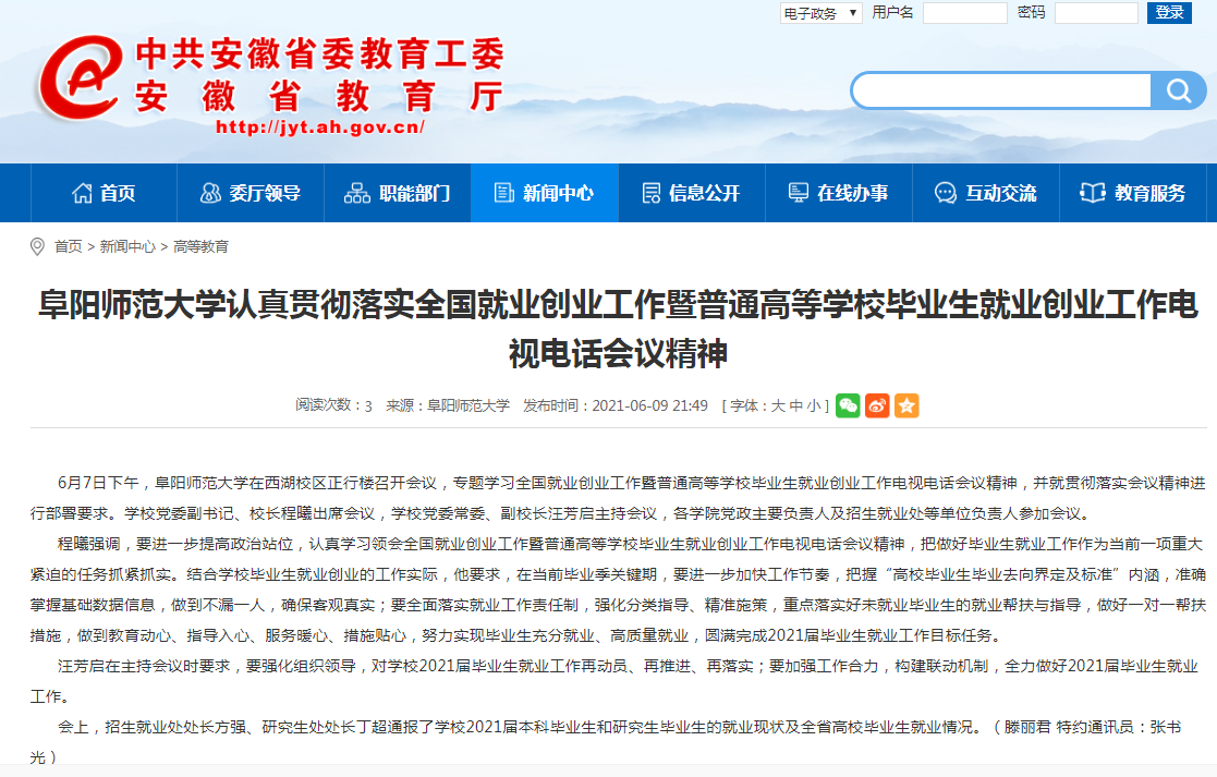 6月9日,安徽教育网首页报道:阜阳师范大学认真贯彻落实全国就业创业工作暨普通高等学校毕业生就业创业工作电视电话会议精神。文章地址:http://jyt.ah.gov.cn/xwzx/gdjy/40437989.html