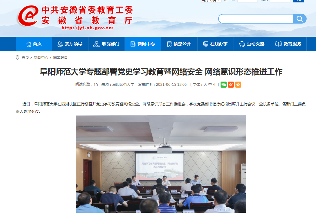 安徽教育网首页报道:阜阳师范大学专题部署党史学习教育暨网络安全 网络意识形态推进工作
