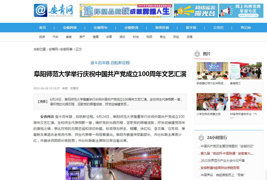 2021年6月26日,安青网报道:阜阳师范大学举行庆祝中国共产党成立100周年文艺汇演。文章地址: