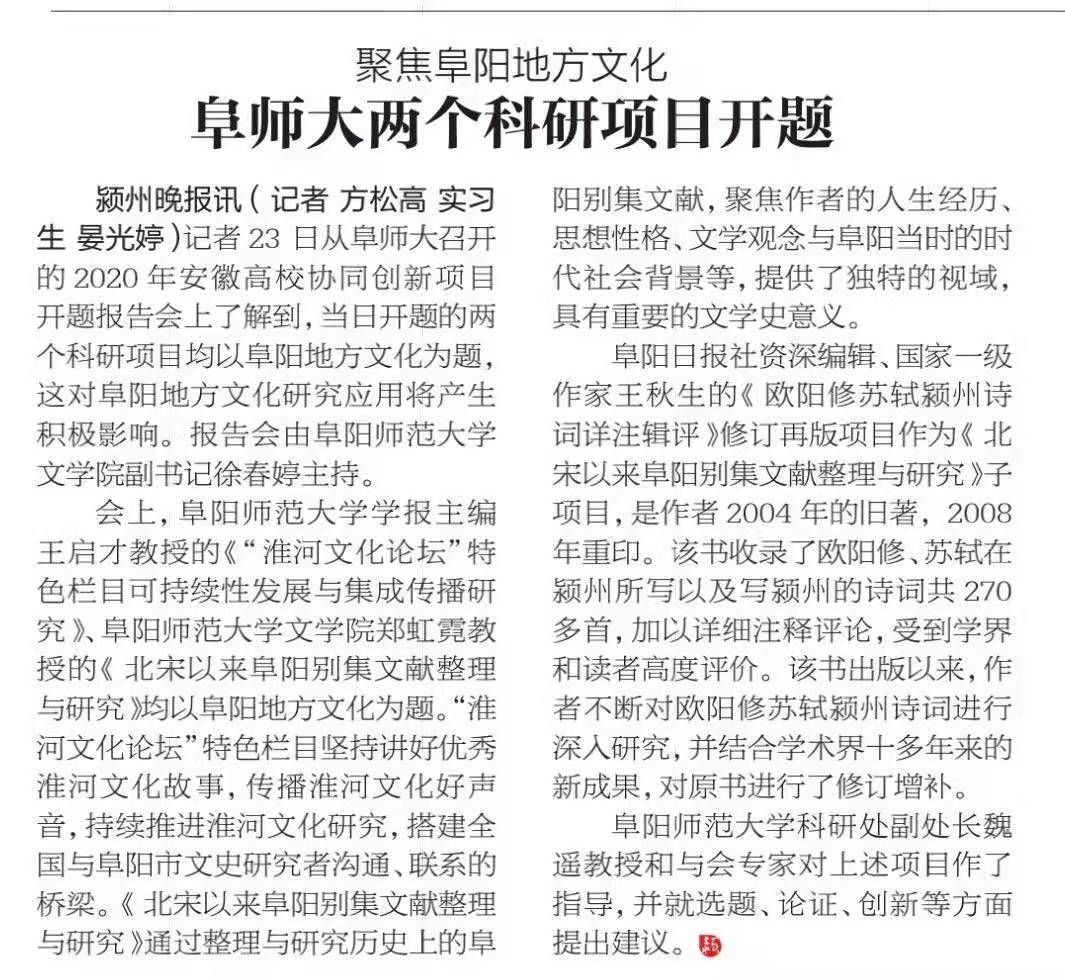 阜阳颍州晚报报道:聚焦阜阳地方文化 阜师大两个科研项目开题