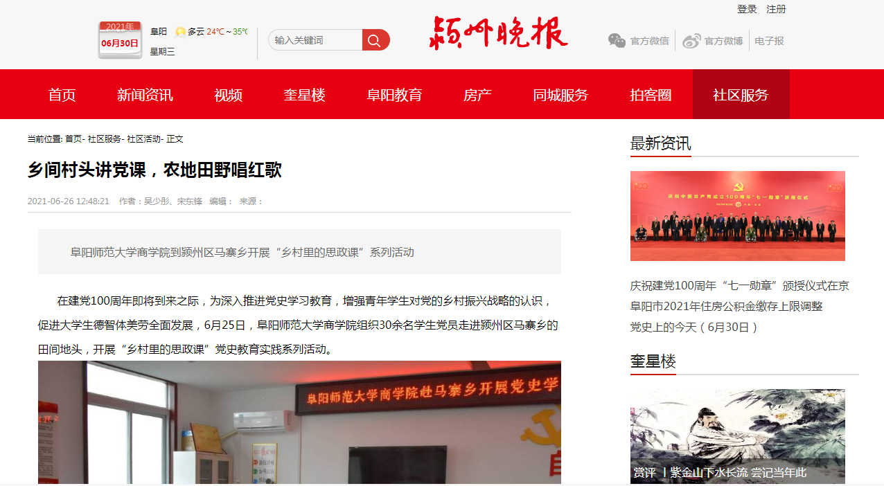 6月26日,阜阳颍州晚报报道:乡间村头讲党课,农地田野唱红歌--阜阳师范大学商学院到颍州区马寨乡开展“乡村里的思政课”系列活动。文章地址:http://fyyzwb.com/a/9060?bsh_bid=5619787577