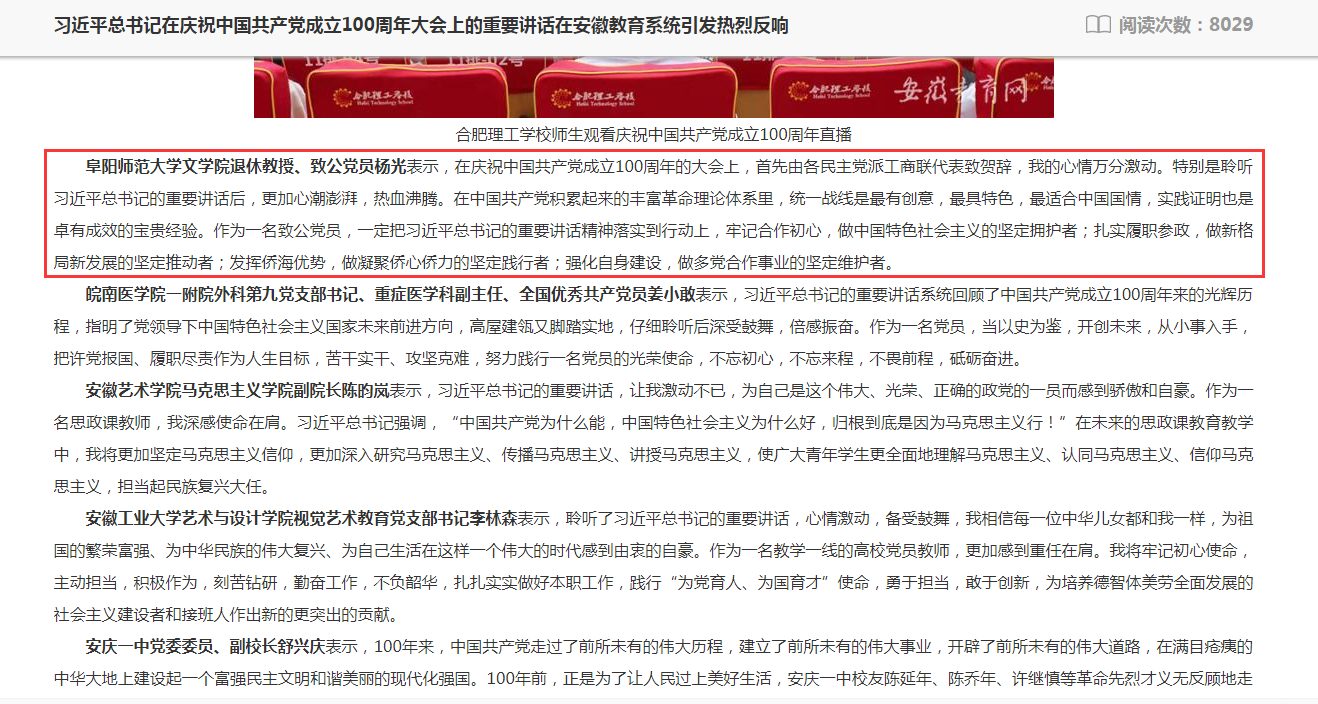 7月1日,安徽教育网报道:我校热议习近平总书记在庆祝中国共产党成立100周年大会上的重要讲话。文章地址: