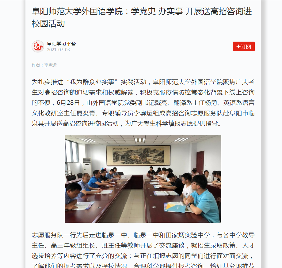 7月3日,“学习强国”阜阳学习平台报道:阜阳师范大学外国语学院:学党史 办实事 开展送高招咨询进校园活动。https://article.xuexi.cn/articles/index.html?art_id=14489374246225735881&item_id=14489374246225735881&study_style_id=feeds_default&t=1625279826656&showmenu=false&ref_read_id=08741e66-a162-4926-a785-01e2772191a9_1625308032896&pid=&ptype=-1&source=share&share_to=wx_single