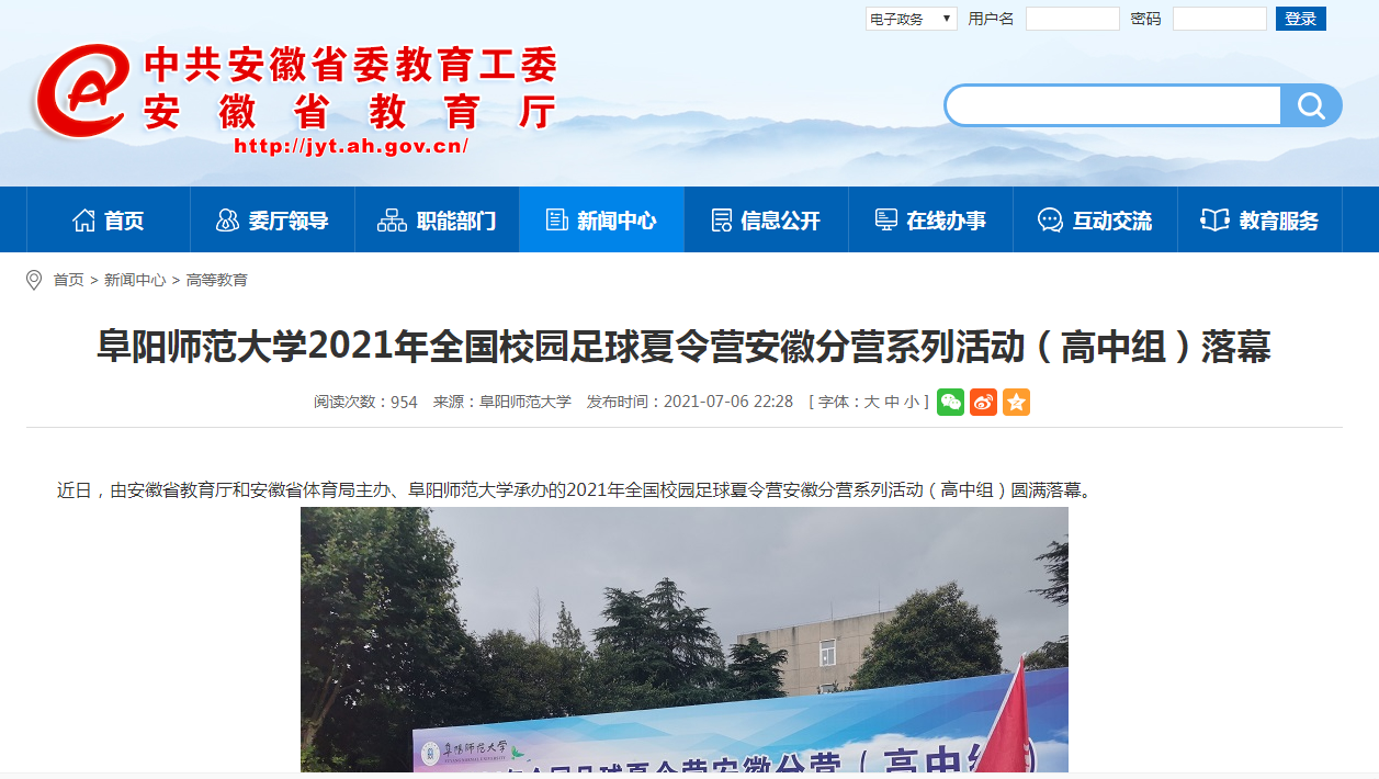 7月06日,安徽教育网首页报道:阜阳师范大学2021年全国校园足球夏令营安徽分营系列活动(高中组)落幕。文章地址:http://jyt.ah.gov.cn/xwzx/gdjy/40446489.html