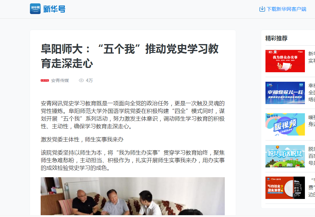 7月14日,新华网报道:“五个我”推动党史学习教育走深走心。文章地址:http://my-h5news.app.xinhuanet.com/xhh-pc/article/?id=29cb8252-c530-4e60-844e-e9827d52e1ae