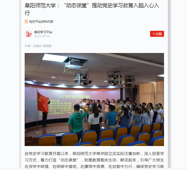 7月21日,学习强国阜阳学习平台报道:阜阳师范大学:“动态课堂”推动党史学习教育入脑入心入行。文章地址:https://article.xuexi.cn/articles/index.html?art_id=13947977101702685105&item_id=13947977101702685105&study_style_id=feeds_default&t=1626861607741&showmenu=false&ref_read_id=2b99ac00-7065-4159-89ab-52a29aaf93b3_1626864399413&pid=&ptype=-1&source=share&share_to=wx_single