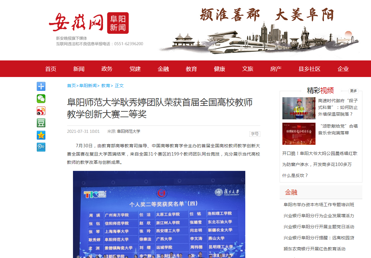 7月31日,安徽网报道:阜阳师范大学耿秀婷团队荣获首届全国高校教师教学创新大赛二等奖。文章地址: