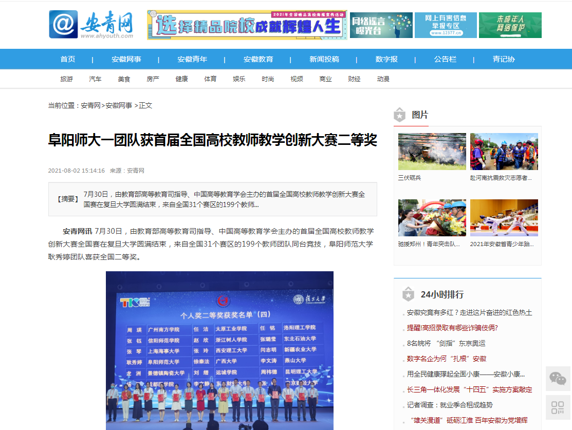 7月30日,安青网报道:阜阳师大一团队获首届全国高校教师教学创新大赛二等奖。文章地址: