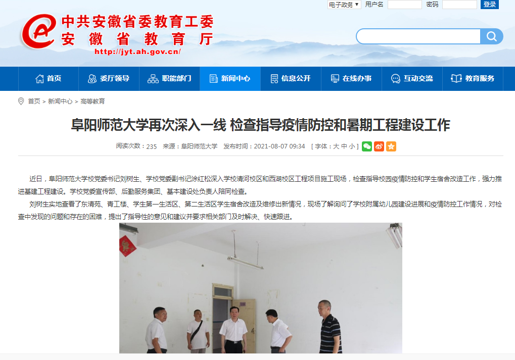 8月7日,安徽教育网报道:阜阳师范大学再次深入一线 检查指导疫情防控和暑期工程建设工作。文章地址: