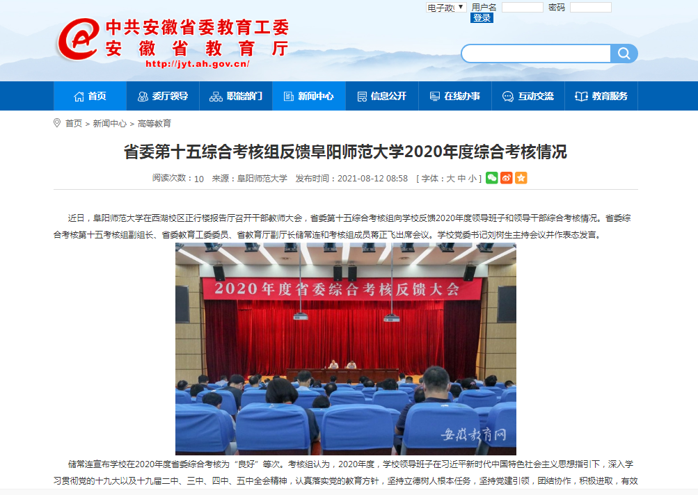 安徽教育网报道:省委第十五综合考核组反馈阜阳师范大学2020年度综合考核情况