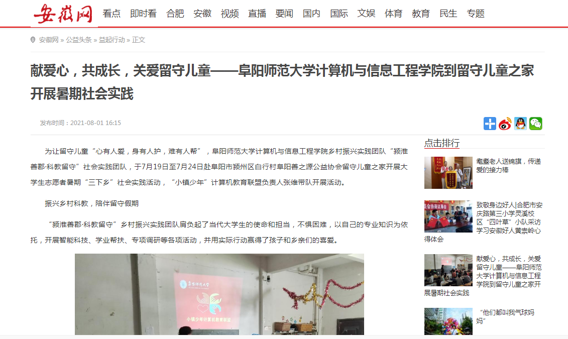 8月1日,安徽网报道:献爱心,共成长,关爱留守儿童——阜阳师范大学计算机与信息工程学院到留守儿童之家开展暑期社会实践。文章地址:http://gongyi.ahwang.cn/yqxd/20210801/2268675.html