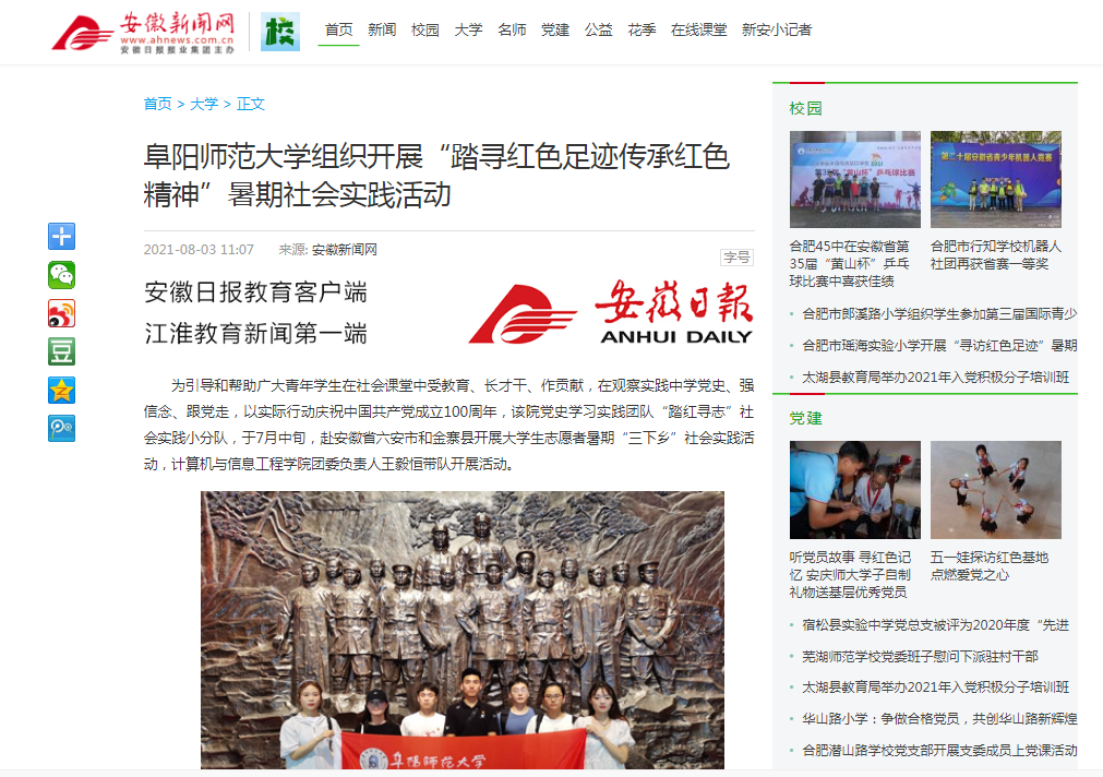 安徽新闻网报道:阜阳师范大学组织开展“踏寻红色足迹传承红色精神”暑期社会实践活动