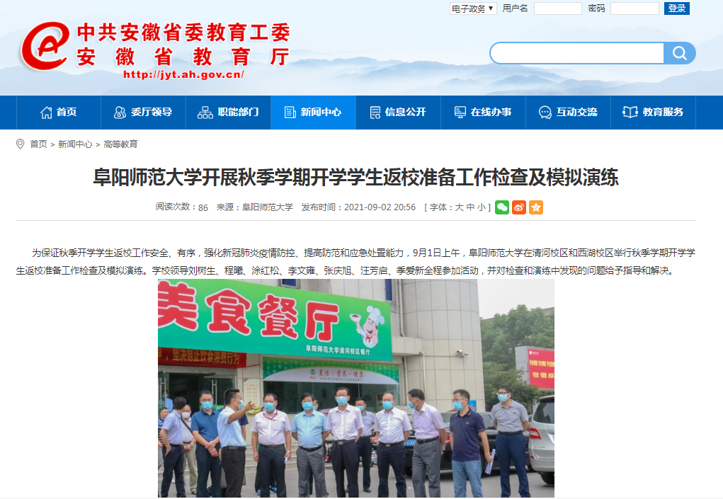 9月2日,安徽教育网报道:阜阳师范大学开展秋季学期开学学生返校准备工作检查及模拟演练。文章地址: