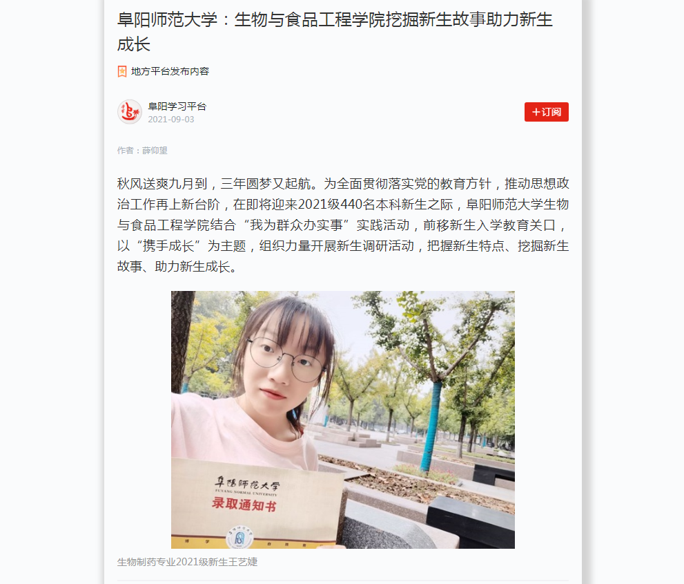 9月3日,学习强国阜阳学习平台报道:阜阳师范大学:生物与食品工程学院挖掘新生故事助力新生成长。文章地址:https://article.xuexi.cn/articles/index.html?art_id=11571119994328717958&item_id=11571119994328717958&study_style_id=feeds_opaque&t=1630659756753&showmenu=false&ref_read_id=a565c404-4388-48ae-8a01-5c47e58c9efe_1630665806643&pid=&ptype=-1&source=share&share_to=wx_single