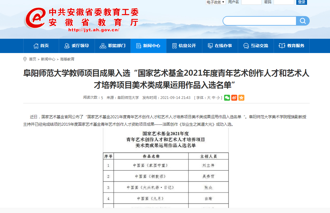 9月14日,安徽教育网报道:阜阳师范大学教师项目成果入选“国家艺术基金2021年度青年艺术创作人才和艺术人才培养项目美术类成果运用作品入选名单”。文章地址:http://jyt.ah.gov.cn/xwzx/gdjy/40468299.html