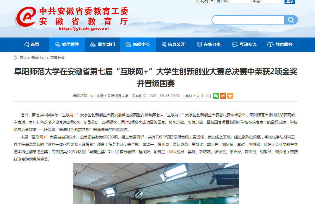 9月15日,安徽教育网报道:阜阳师范大学在安徽省第七届“互联网+”大学生创新创业大赛总决赛中荣获2项金奖并晋级国赛。文章地址:http://jyt.ah.gov.cn/xwzx/gdjy/40468697.html