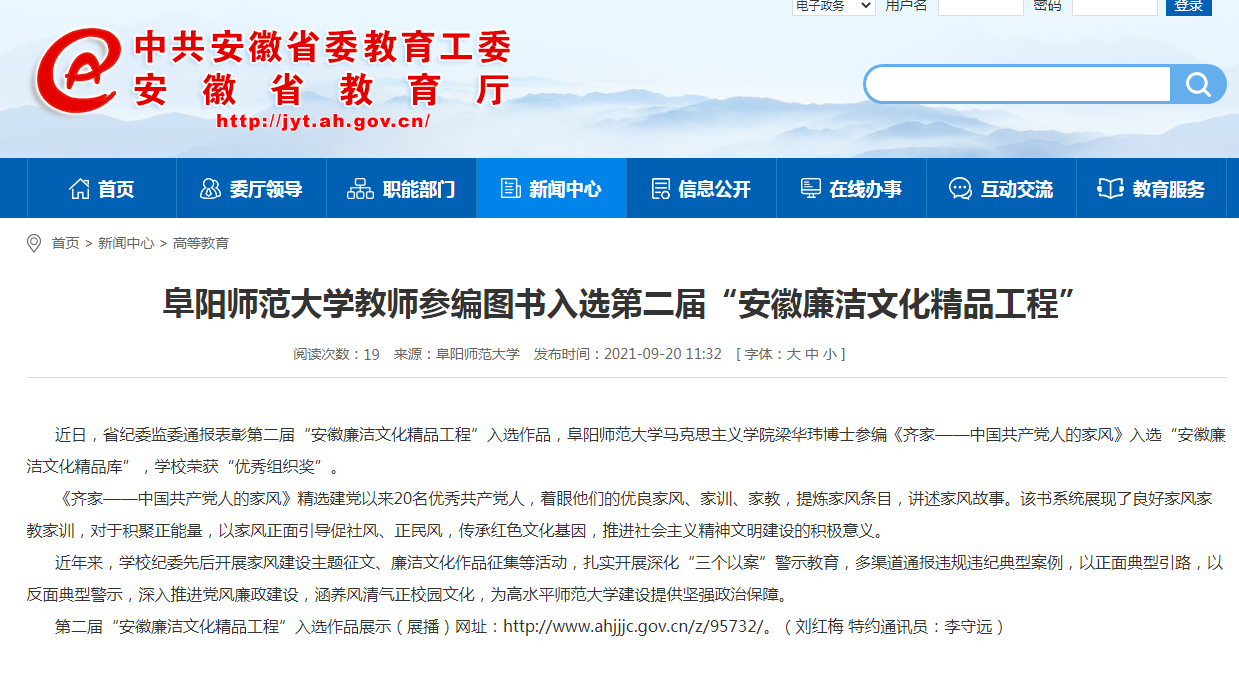 安徽省教育网报道:阜阳师范大学教师参编图书入选第二届“安徽廉洁文化精品工程”