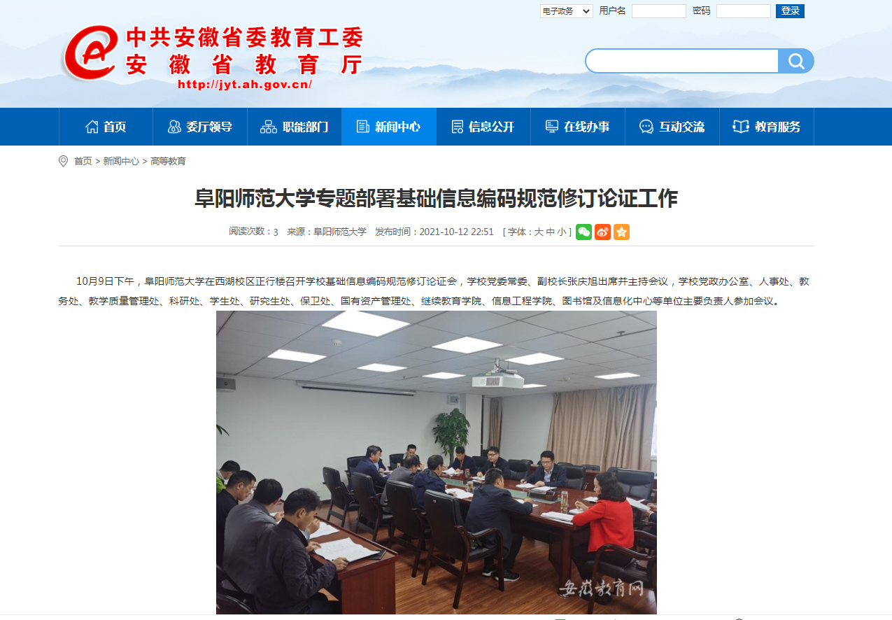 10月12日,安徽教育网报道:阜阳师范大学专题部署基础信息编码规范修订论证工作。文章地址: