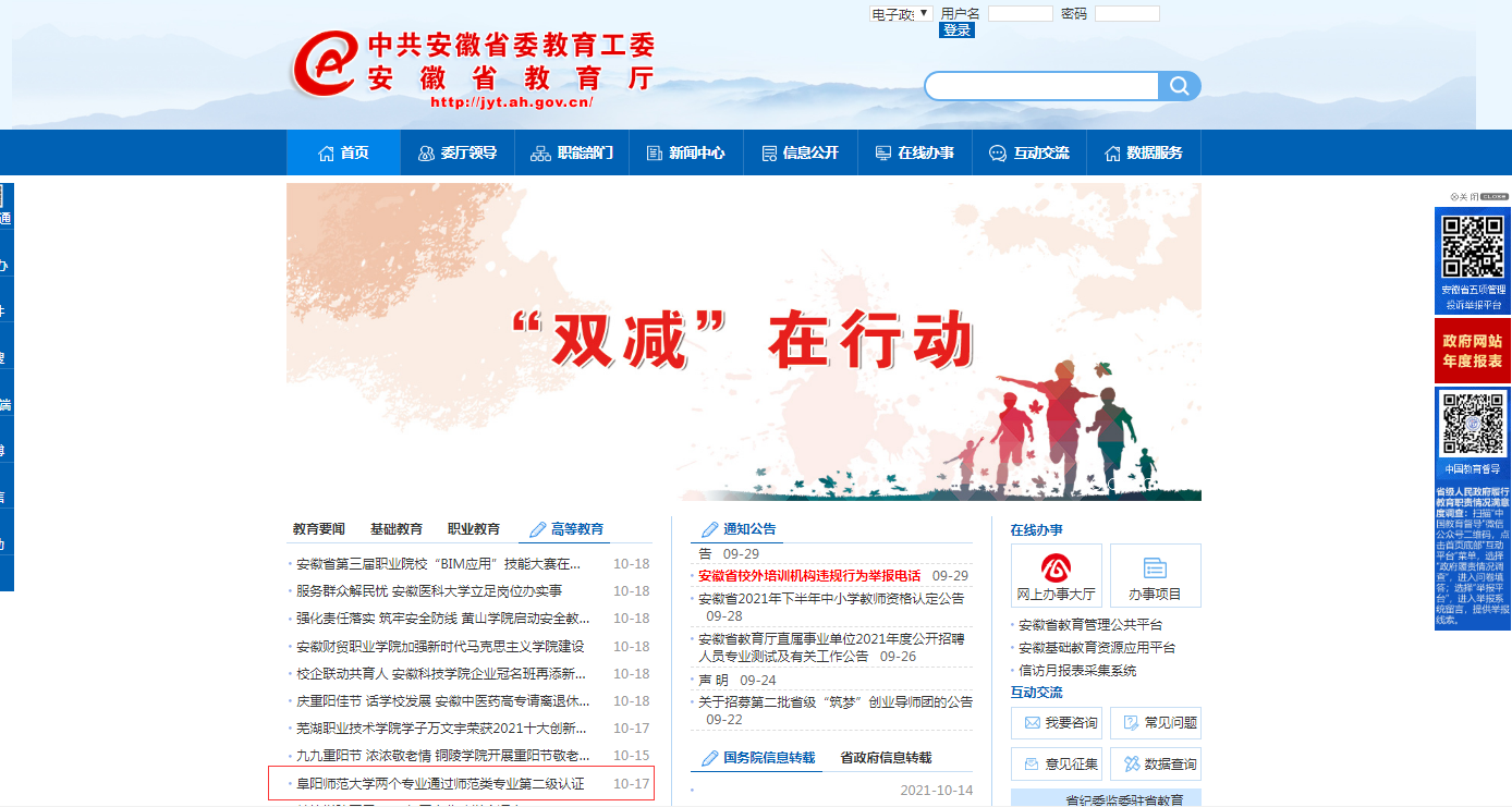 10月17日,安徽教育网报道:阜阳师范大学两个专业通过师范类专业第二级认证。文章地址: