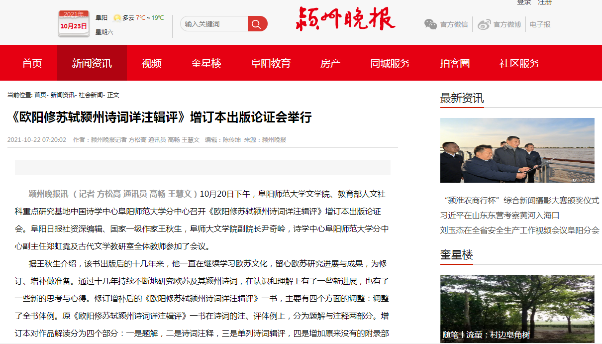 10月22日,颍州晚报报道:《欧阳修苏轼颍州诗词详注辑评》增订本出版论证会举行。文章地址: