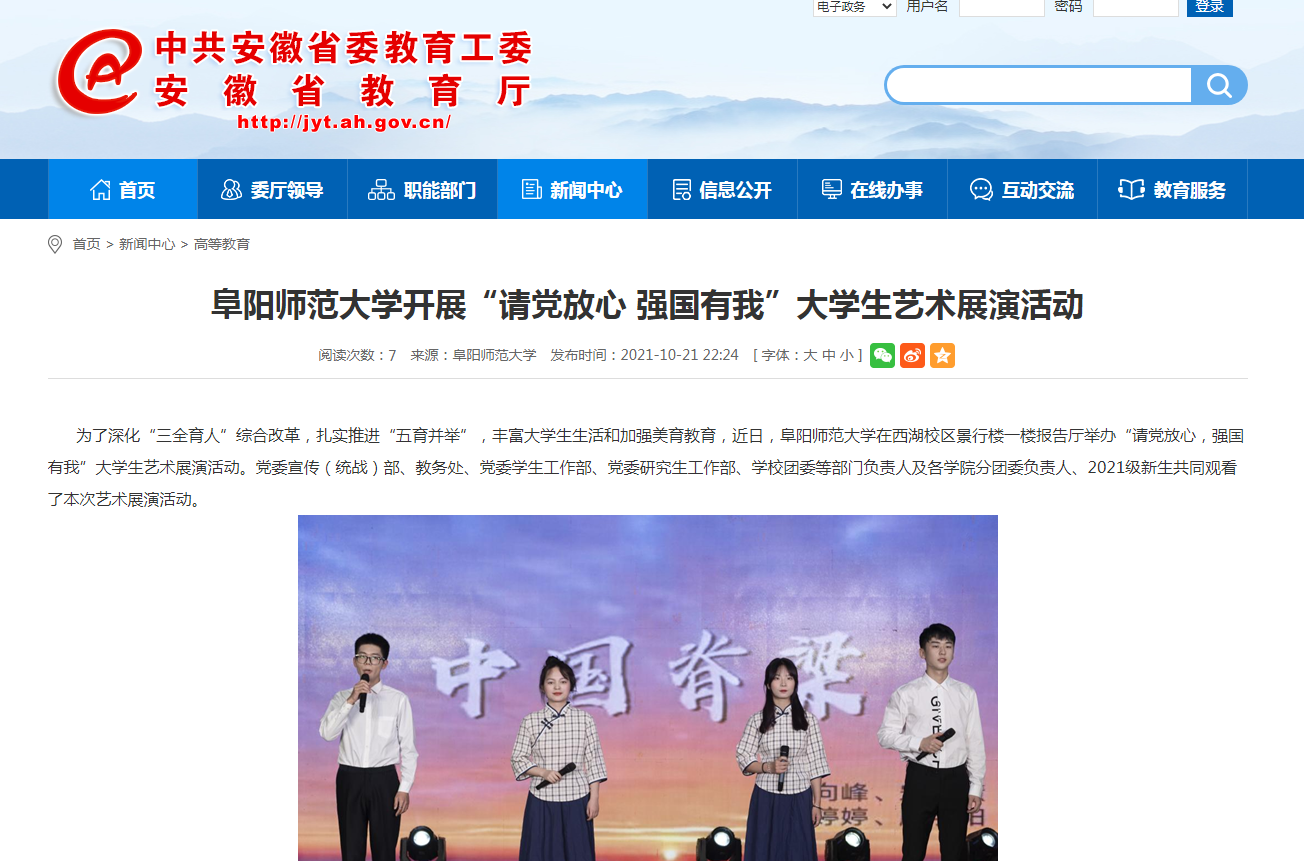 10月21日,安徽省教育网报道:阜阳师范大学开展“请党放心 强国有我”大学生艺术展演活动。文章地址: