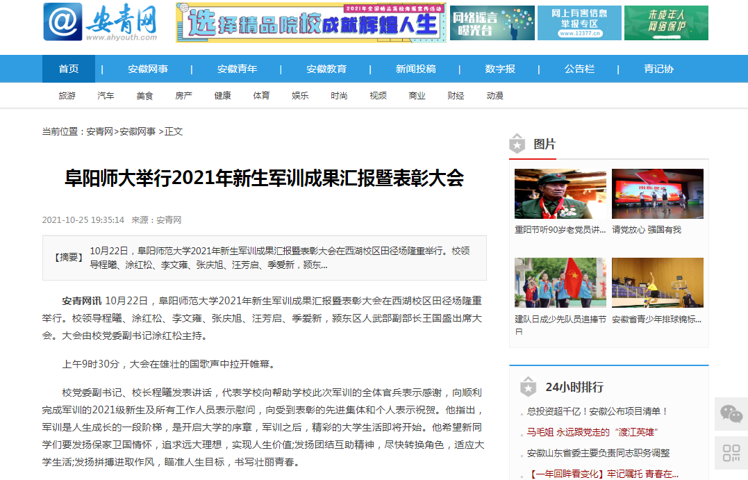 10月25日,安青网报道:阜阳师大举行2021年新生军训成果汇报暨表彰大会。文章地址: