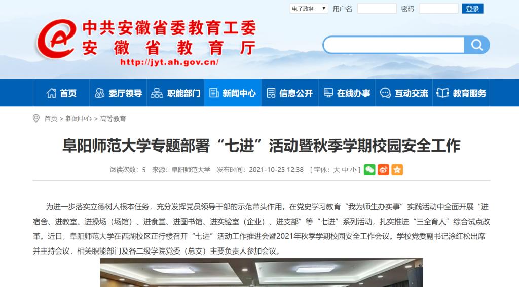 10月25日,安徽教育网报道:阜阳师范大学专题部署“七进”活动暨秋季学期校园安全工作。文章地址: