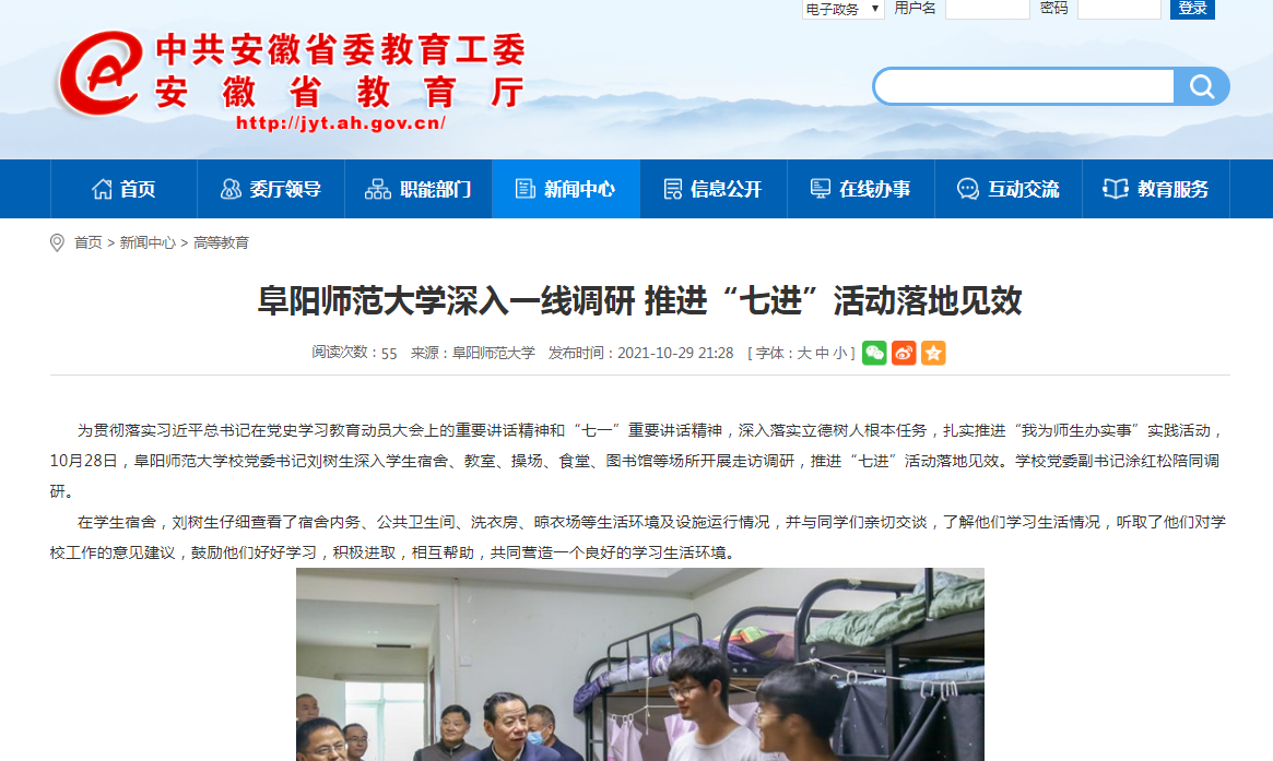 10月29日,安徽教育网报道:阜阳师范大学深入一线调研 推进“七进”活动落地见效。文章地址: