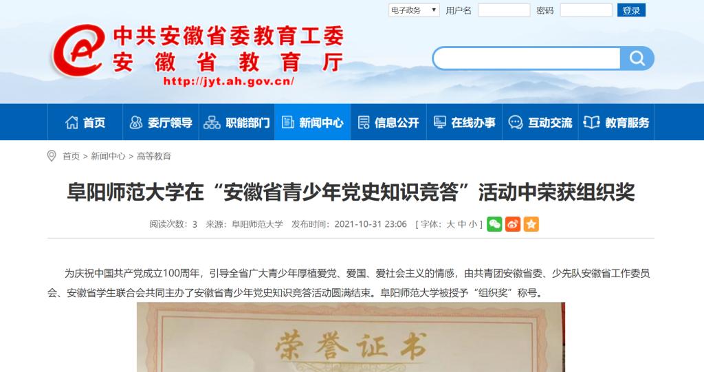 安徽教育网报道:阜阳师范大学在“安徽省青少年党史知识竞答”活动中荣获组织奖