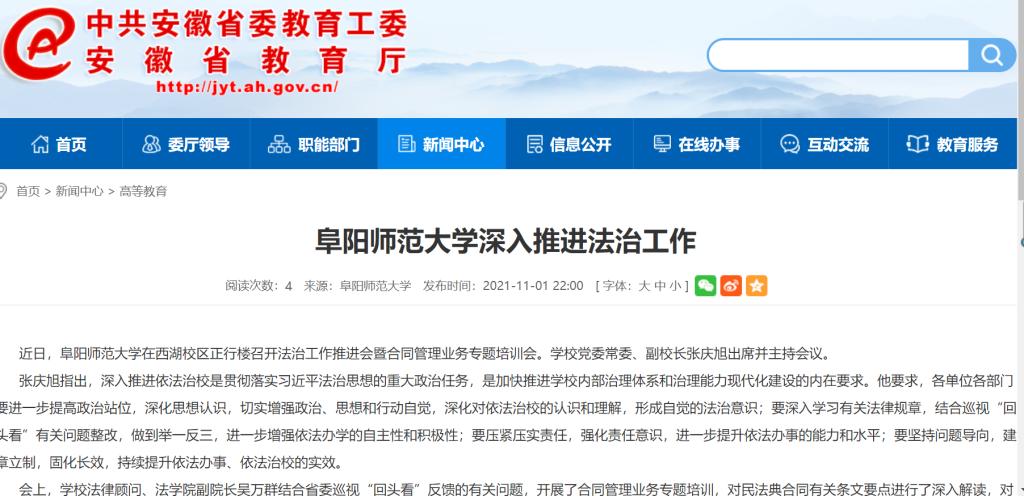 11月1日,安徽教育网报道:阜阳师范大学深入推进法治工作。文章地址: