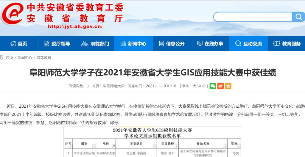 11月10日,安徽教育网报道:阜阳师范大学学子在2021年安徽省大学生GIS应用技能大赛中获佳绩。文章地址: