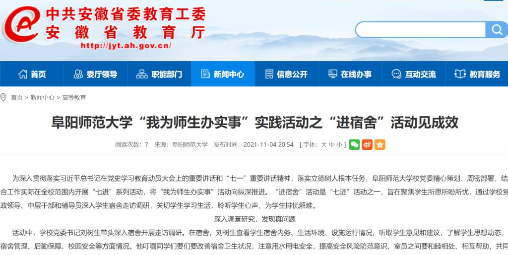 11月4日,安徽教育网报道:阜阳师范大学“我为师生办实事”实践活动之“进宿舍”活动见成效。文章地址: