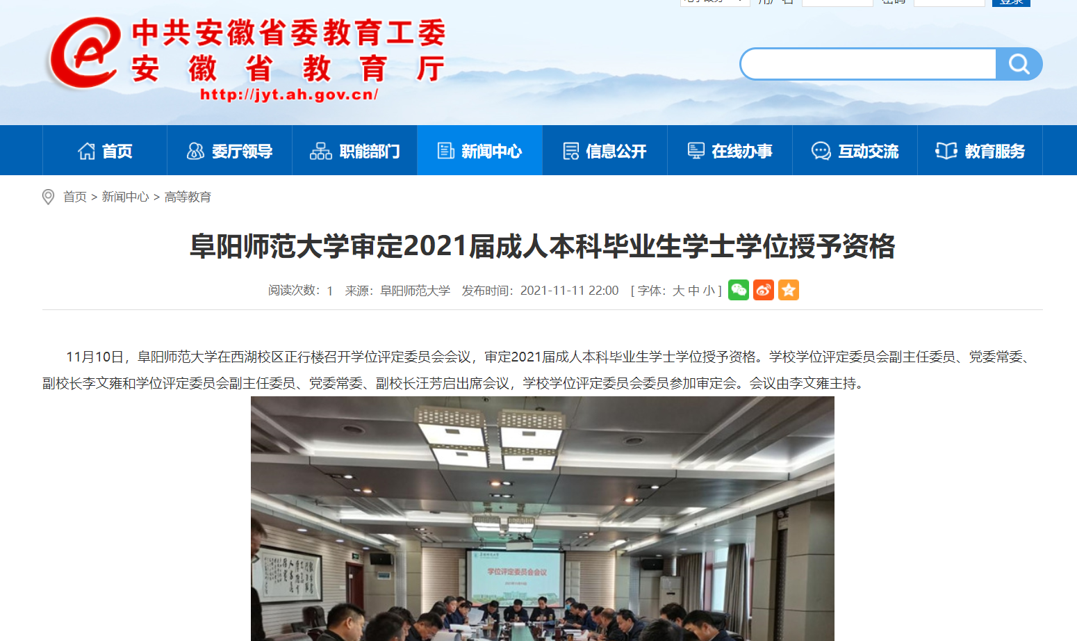 11月11日,安徽教育网报道:阜阳师范大学审定2021届成人本科毕业生学士学位授予资格。文章地址: