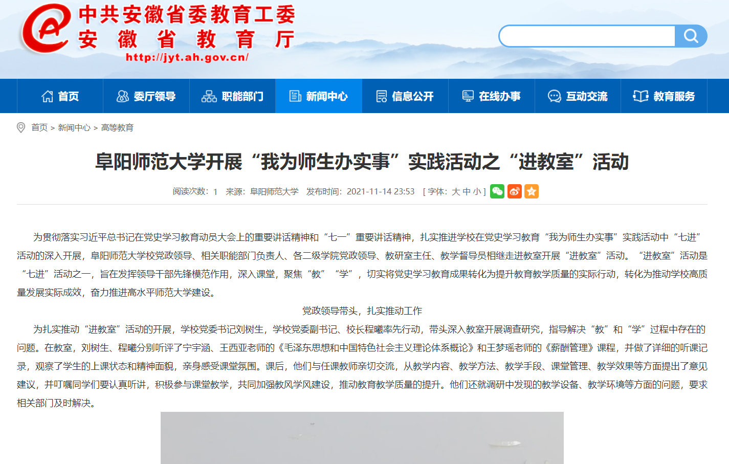 11月14日,安徽教育网报道:阜阳师范大学开展“我为师生办实事”实践活动之“进教室”活动。文章地址: