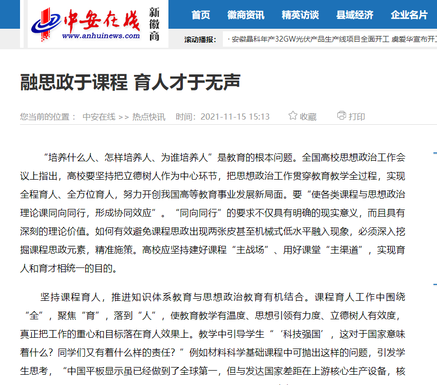 11月15日,中安在线报道:融思政于课程 育人才于无声。文章地址: