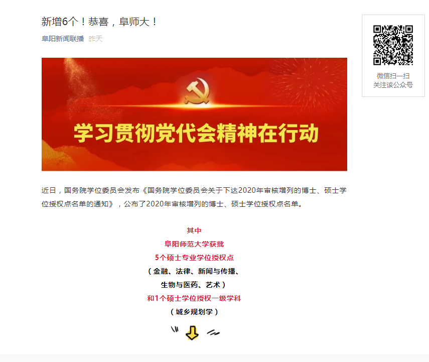 11月16日,阜阳新闻联播微信平台报道:阜阳师范大学获批5个硕士专业学位授权点和1个硕士学位授权一级学科。文章地址:https://mp.weixin.qq.com/s?__biz=Mzg4NzEyODA1OQ==&mid=2247633363&idx=1&sn=90b287060c836d58352e1ff649947618&chksm=cf83a347f8f42a51f3e9d04c6843b996537195e3a291c1946b62cef9be6c5a6bde2aed7cb1b8&mpshare=1&scene=23&srcid=1116ZeqtBIZa5xRcb8KvEBCy&sharer_sharetime=1637118472711&sharer_shareid=b8542902f3f2de5e6064d9a4ef374629#rd