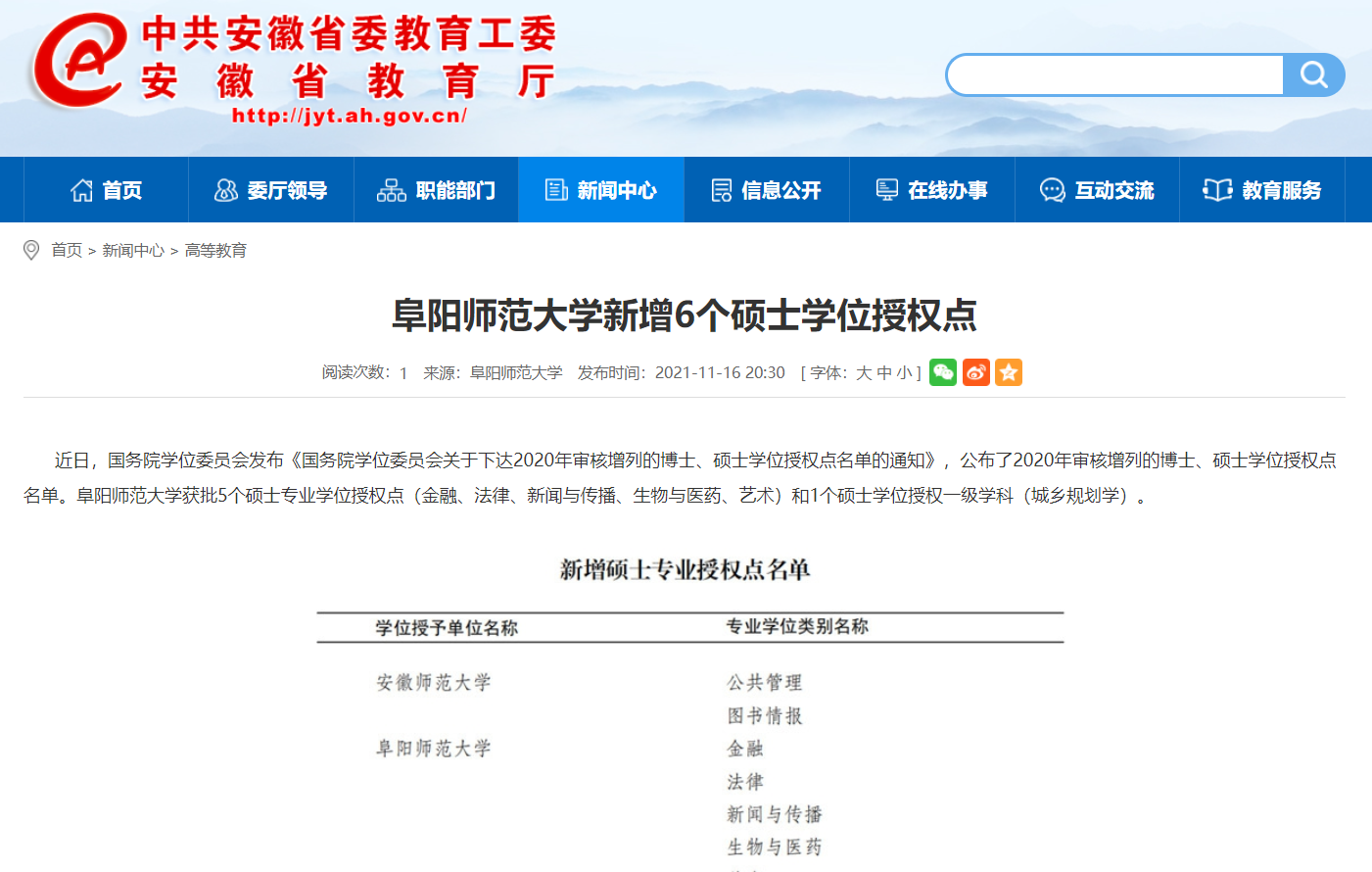 11月16日,安徽教育网报道:阜阳师范大学新增6个硕士学位授权点。文章地址: