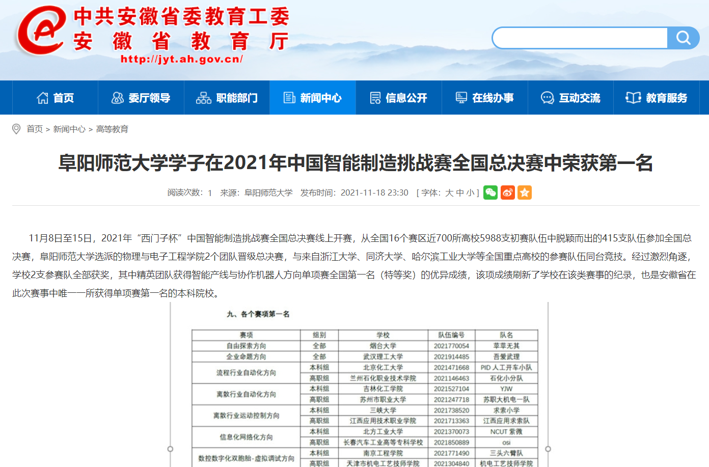 11月18日,安徽教育网报道:阜阳师范大学学子在2021年中国智能制造挑战赛全国总决赛中荣获第一名。文章地址: