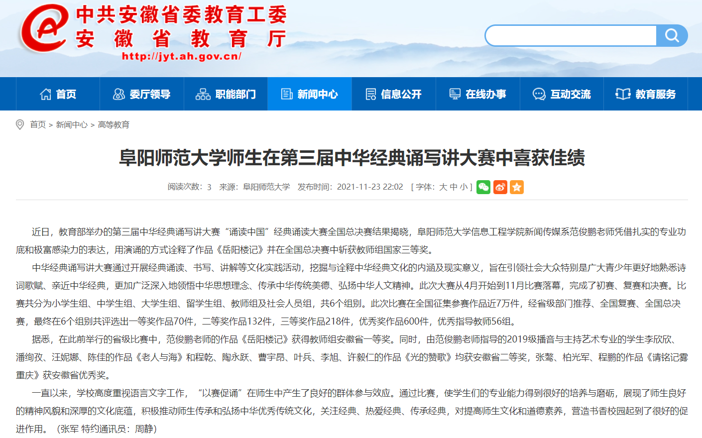安徽教育网报道:阜阳师范大学师生在第三届中华经典诵写讲大赛中喜获佳绩