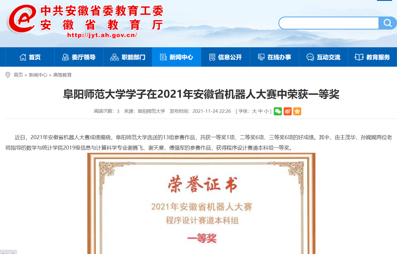 11月24日,安徽教育网报道:阜阳师范大学学子在2021年安徽省机器人大赛中荣获一等奖。文章地址: