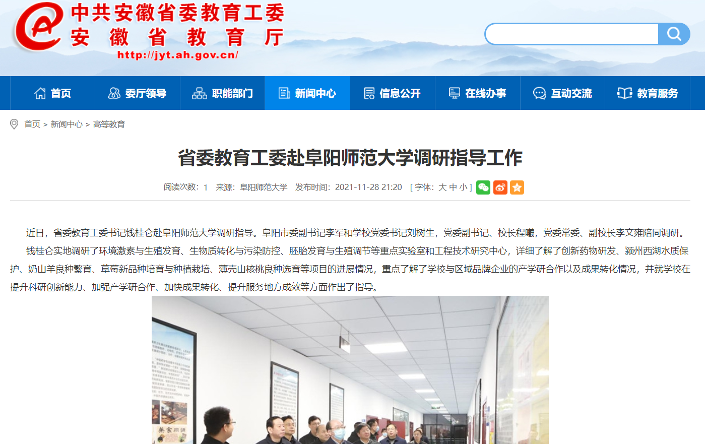11月28日,安徽教育网报道:省委教育工委赴阜阳师范大学调研指导工作。文章地址: