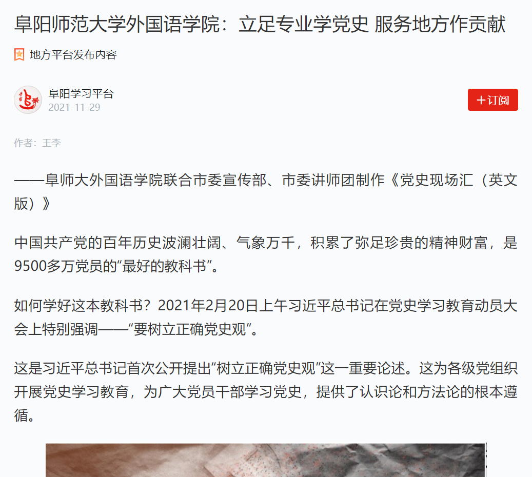 11月29日,“学习强国”阜阳学习平台报道:阜阳师范大学外国语学院:立足专业学党史 服务地方作贡献。文章地址:https://article.xuexi.cn/articles/index.html?art_id=11616726513038029826&item_id=11616726513038029826&study_style_id=feeds_opaque&t=1638176588067&showmenu=false&ref_read_id=61f02edb-370e-4cb6-a373-f992404cd4a0_1638177526938&pid=&ptype=-1&source=share&share_to=wx_single