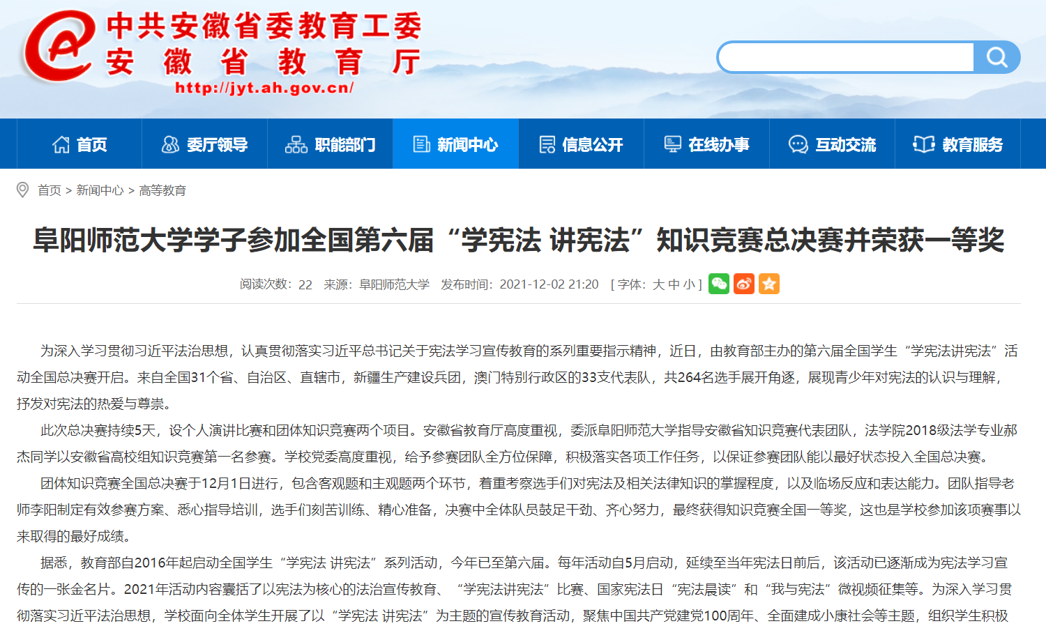 12月2日,安徽教育网报道:阜阳师范大学学子参加全国第六届“学宪法 讲宪法”知识竞赛总决赛并荣获一等奖。文章地址:http://jyt.ah.gov.cn/xwzx/gdjy/40492783.html