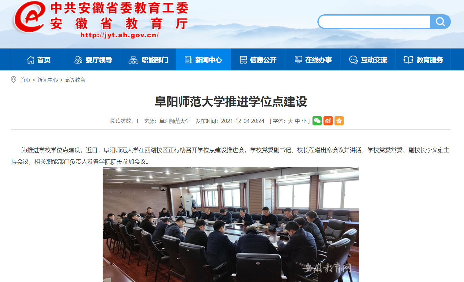 12月4日,安徽教育网报道:阜阳师范大学推进学位点建设。文章地址: