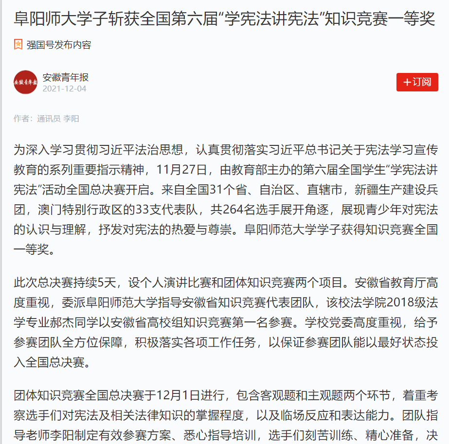12月4日,“学习强国”安徽青年报报道:阜阳师大学子斩获全国第六届“学宪法讲宪法”知识竞赛一等奖。文章地址:https://article.xuexi.cn/articles/index.html?art_id=9889130505411710246&item_id=9889130505411710246&study_style_id=feeds_opaque&pid=&ptype=-1&source=share&share_to=wx_single