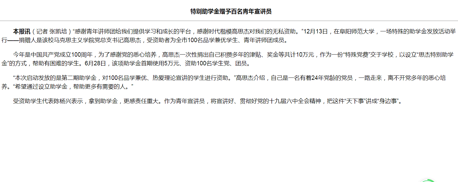 12月14日,阜阳日报报道:阜阳师范大学特别助学金赠与百名青年宣讲员。文章地址:https://test.fynews.net/mepaper/mobile/paper/story?pubCode=fyrb&pubDate=2021-12-15&pageTitle=A2&link=1#s_97158fd2947f32e81cfa49f03cc5a3c58b49b926053747e7acbc5c783d038ffd