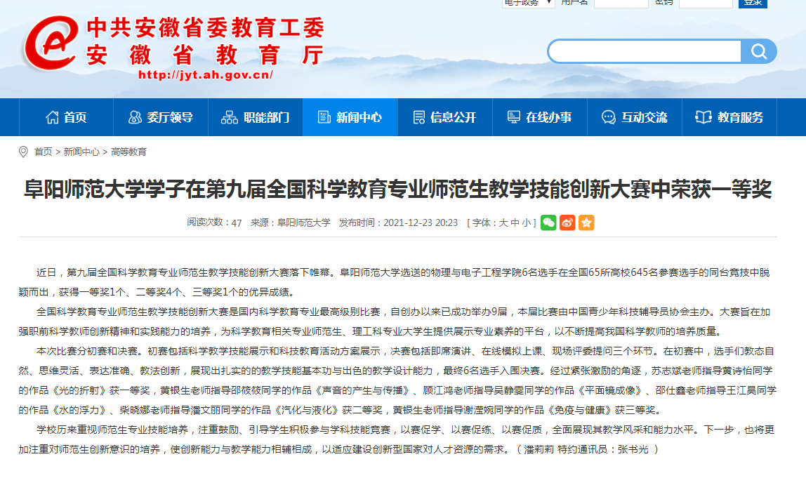 12月23日,安徽教育网报道:阜阳师范大学学子在第九届全国科学教育专业师范生教学技能创新大赛中荣获一等奖。文章地址:http://jyt.ah.gov.cn/xwzx/gdjy/40499290.html