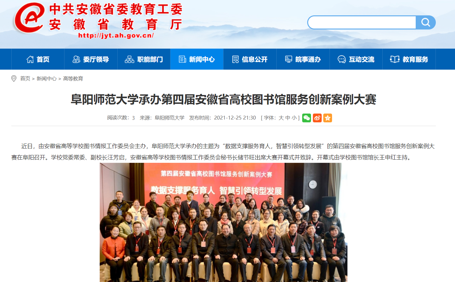 12月25日,安徽教育网报道:阜阳师范大学承办第四届安徽省高校图书馆服务创新案例大赛。文章地址: