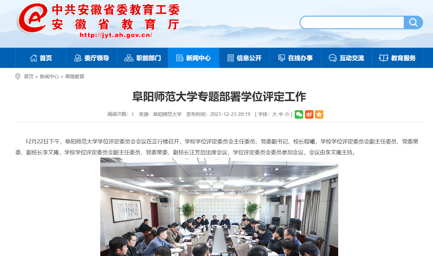 12月23日,安徽教育网报道:阜阳师范大学专题部署学位评定工作。文章地址: