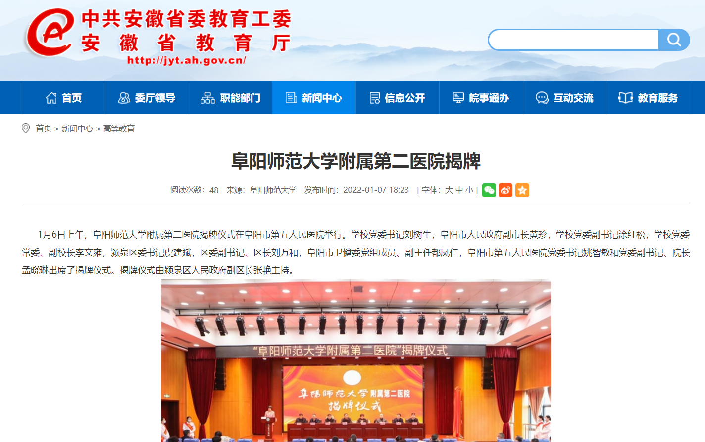 1月7日,安徽教育网报道:阜阳师范大学附属第二医院揭牌。文章地址:
